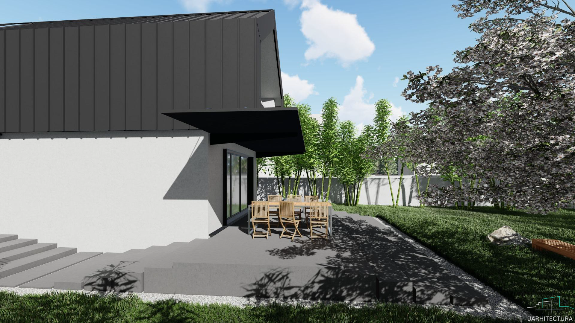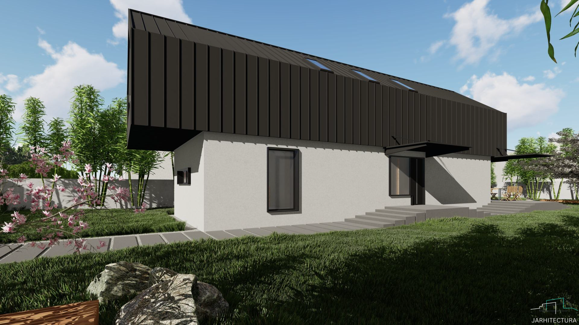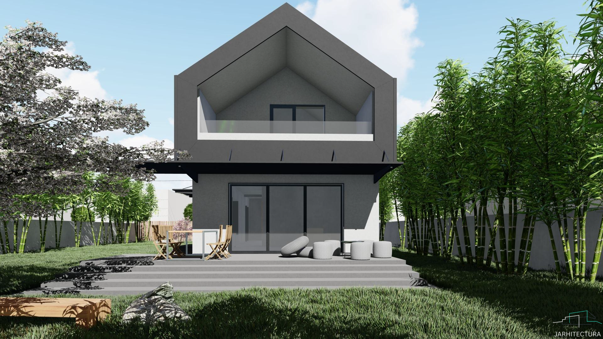 Casa cuprinde 2 camere, living si 3 bai. Bucataria impreuna cu dining-ul fac parte din zona de zi. Este ideala unei familii cu un copil.
