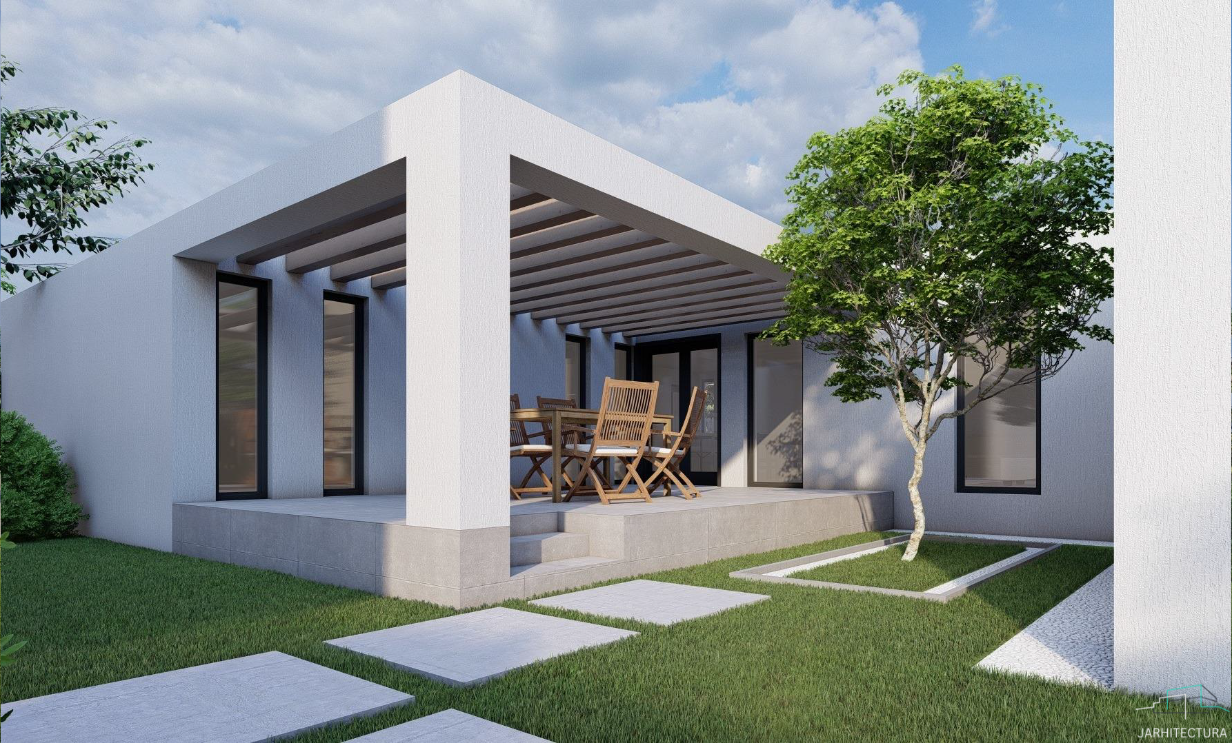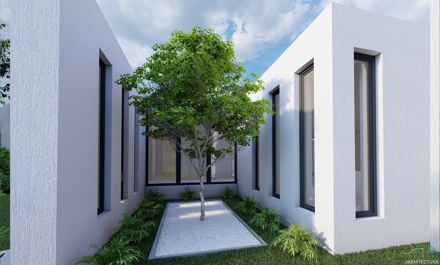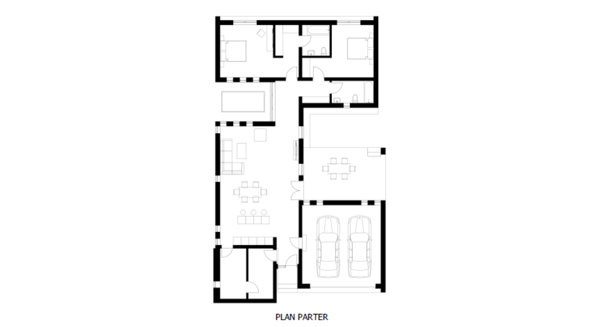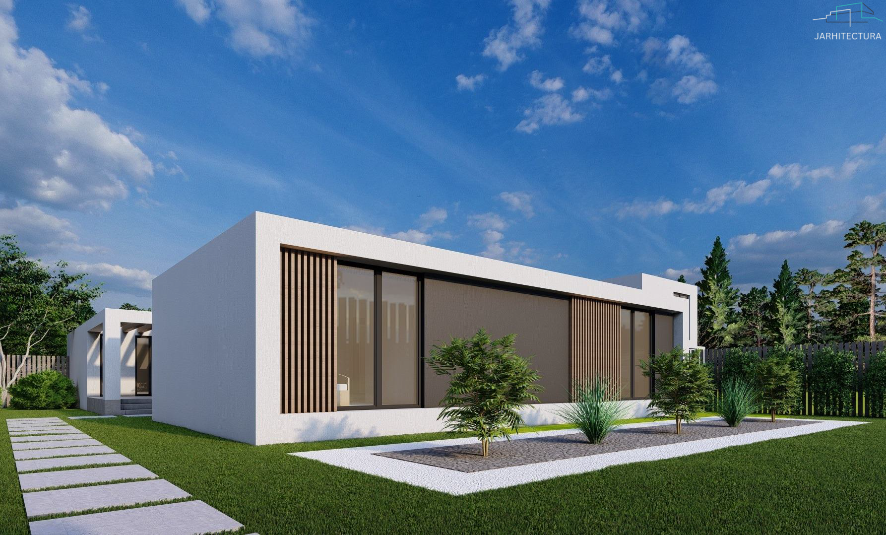 Casa cuprinde 2 camere, living si 2 bai. Bucataria impreuna cu dining-ul fac parte din zona de zi alaturi de living. De asenenea care cuprinde si un garaj spre strada. Este ideala unei familii cu un copil.
