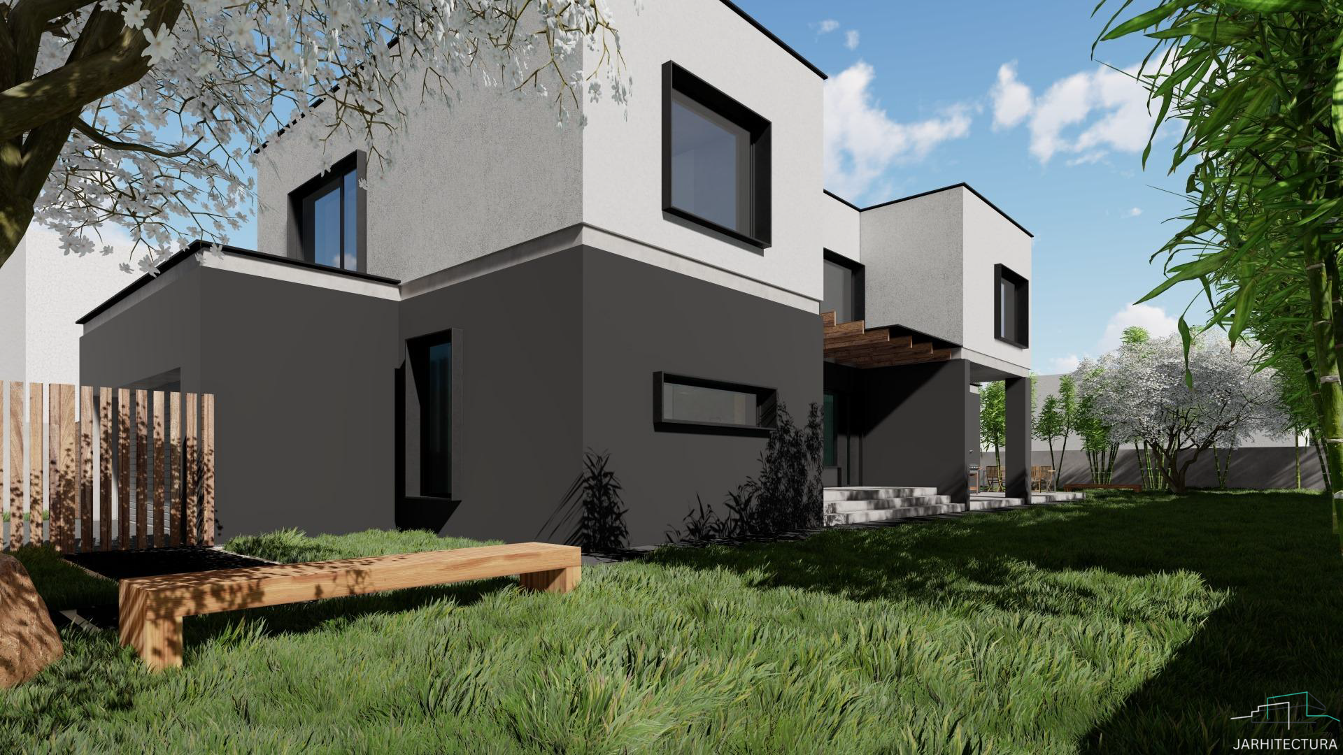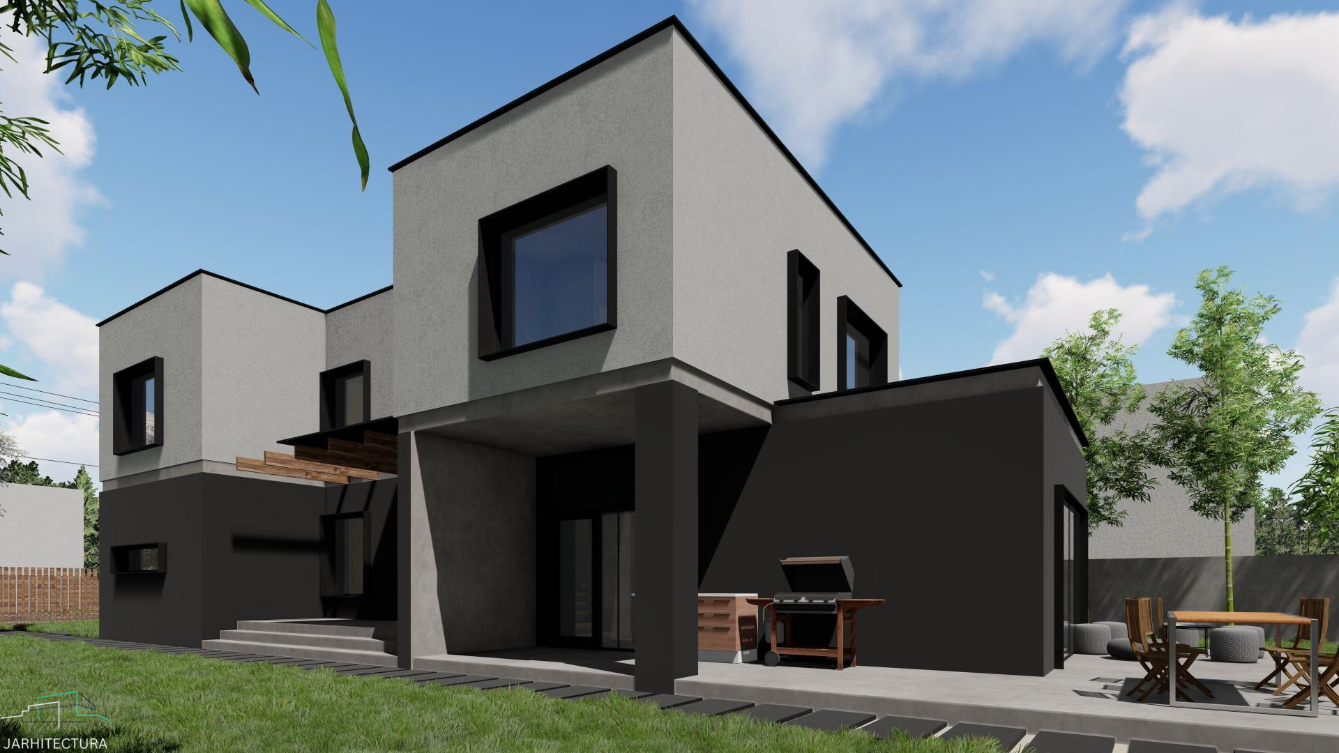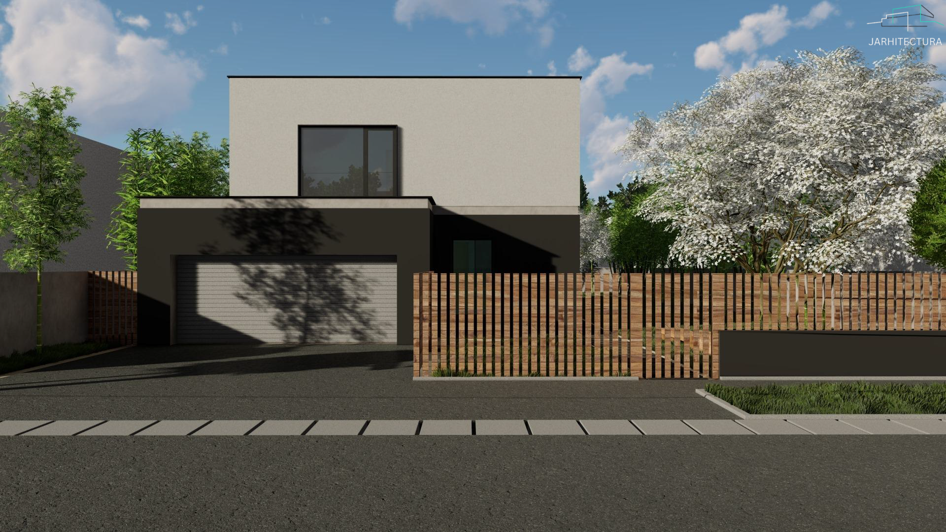 Casa cuprinde 4 camere, living si 3 bai. Livingul impreuna cu zona de dining alcatuiesc zona de zi. De asenenea casa cuprinde si un garaj spre strada. Este ideala unei familii cu doi copii.