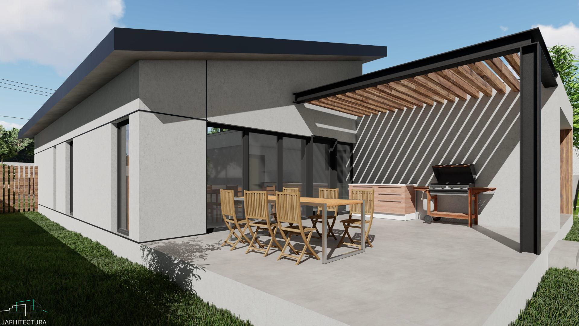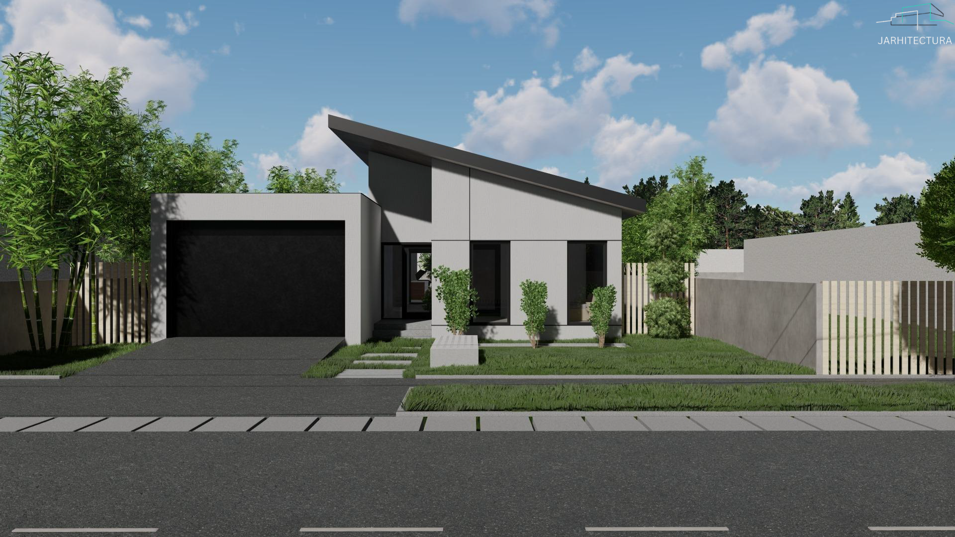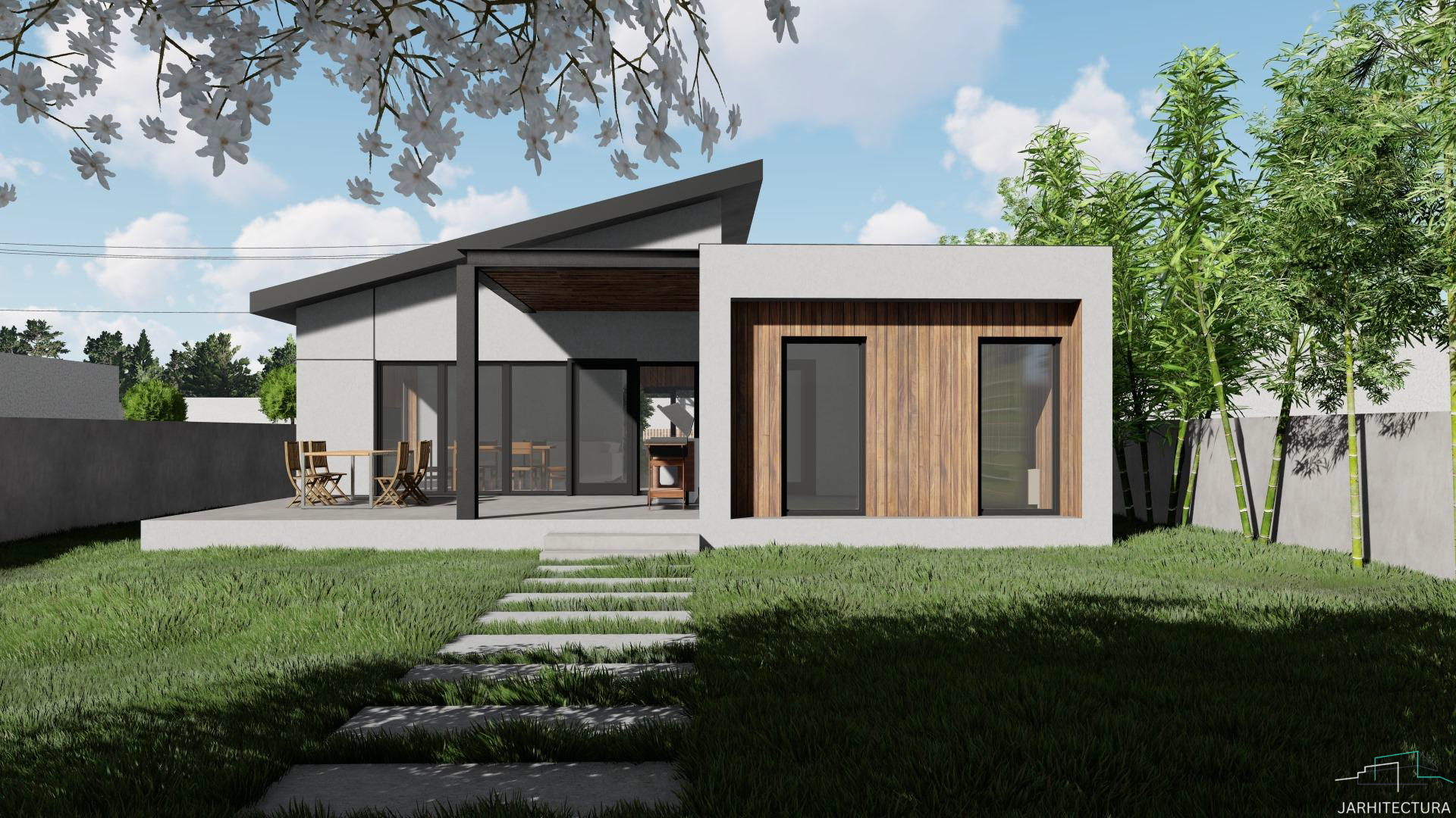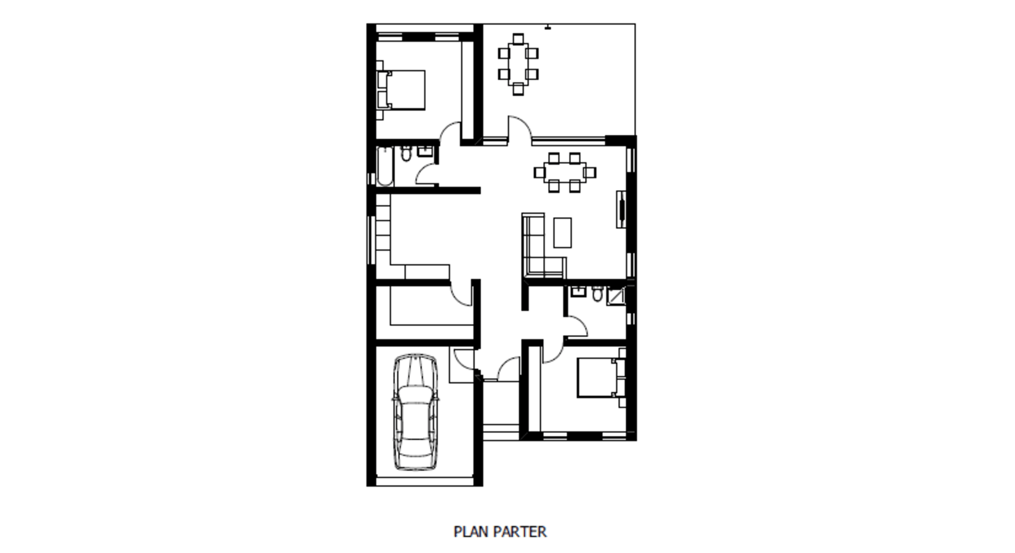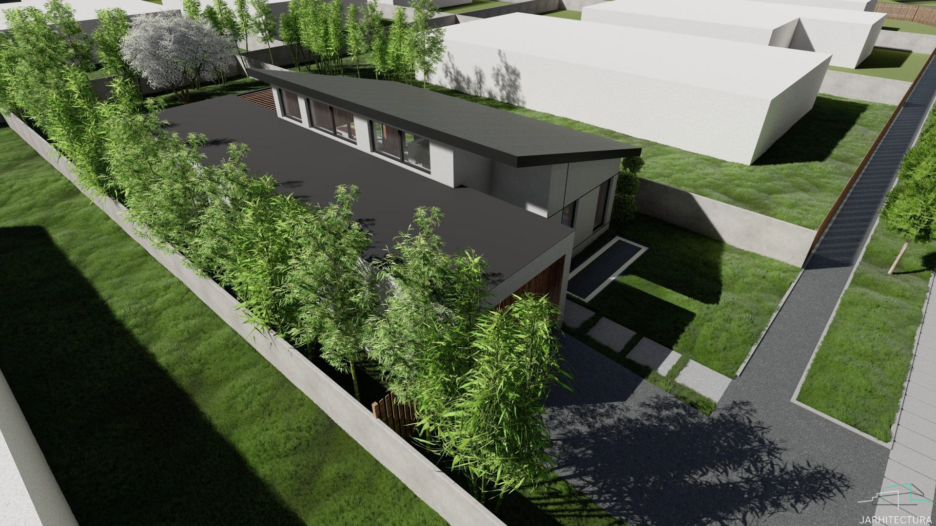 Casa cuprinde 2 camere, living si 2 bai. Bucataria impreuna cu dining-ul fac parte din zona de zi alaturi de living. De asemenea aceasta cuprinde si un garaj la strada. Este ideala unei familii cu un copil.